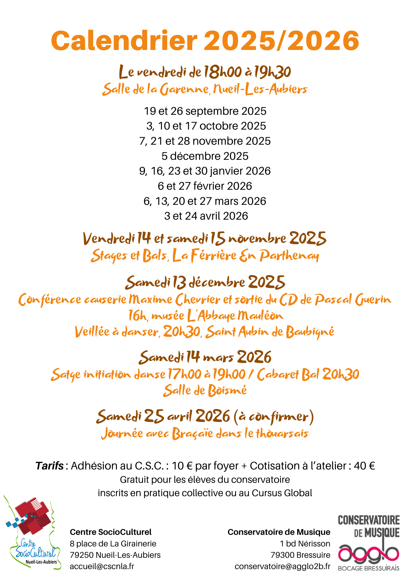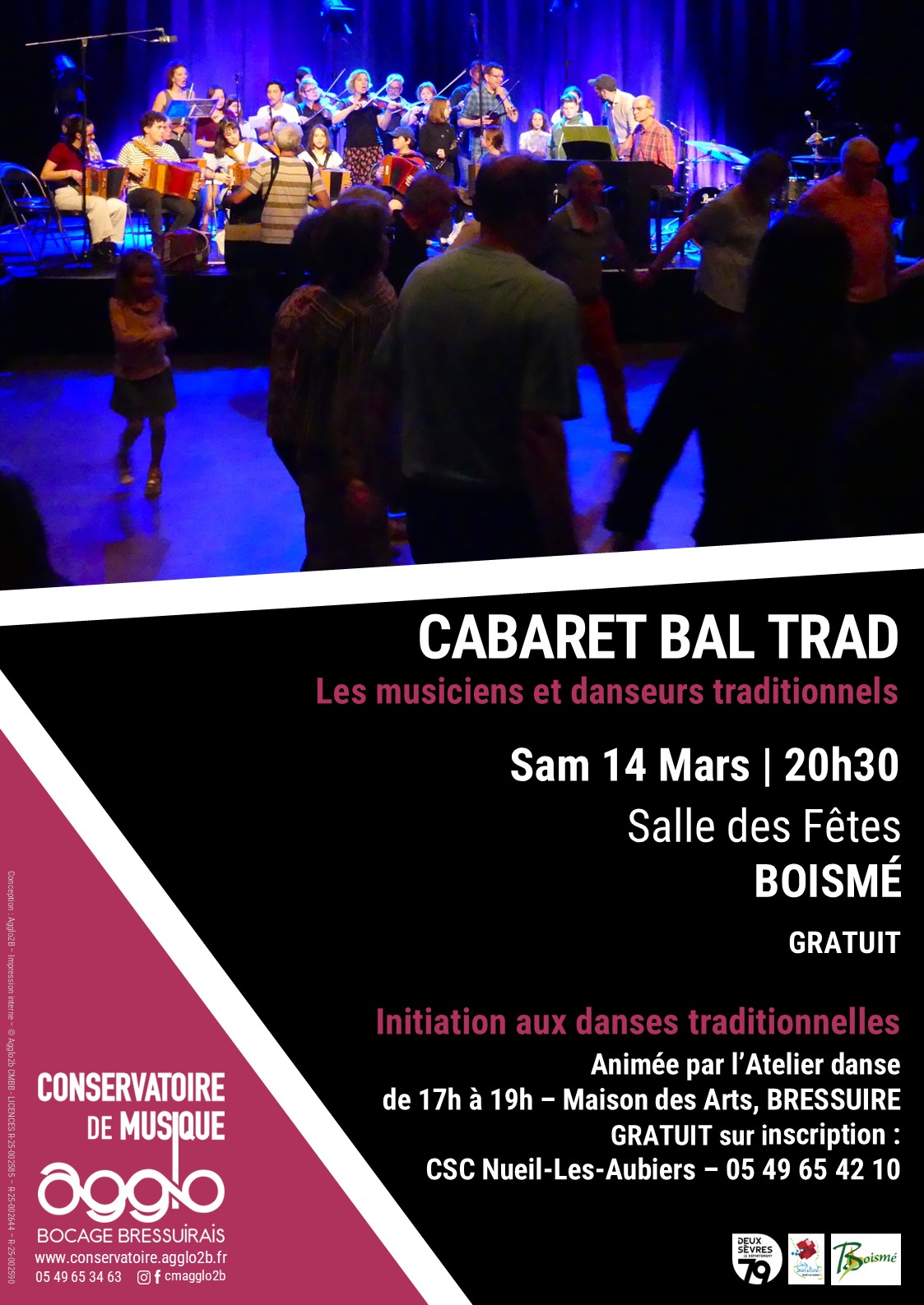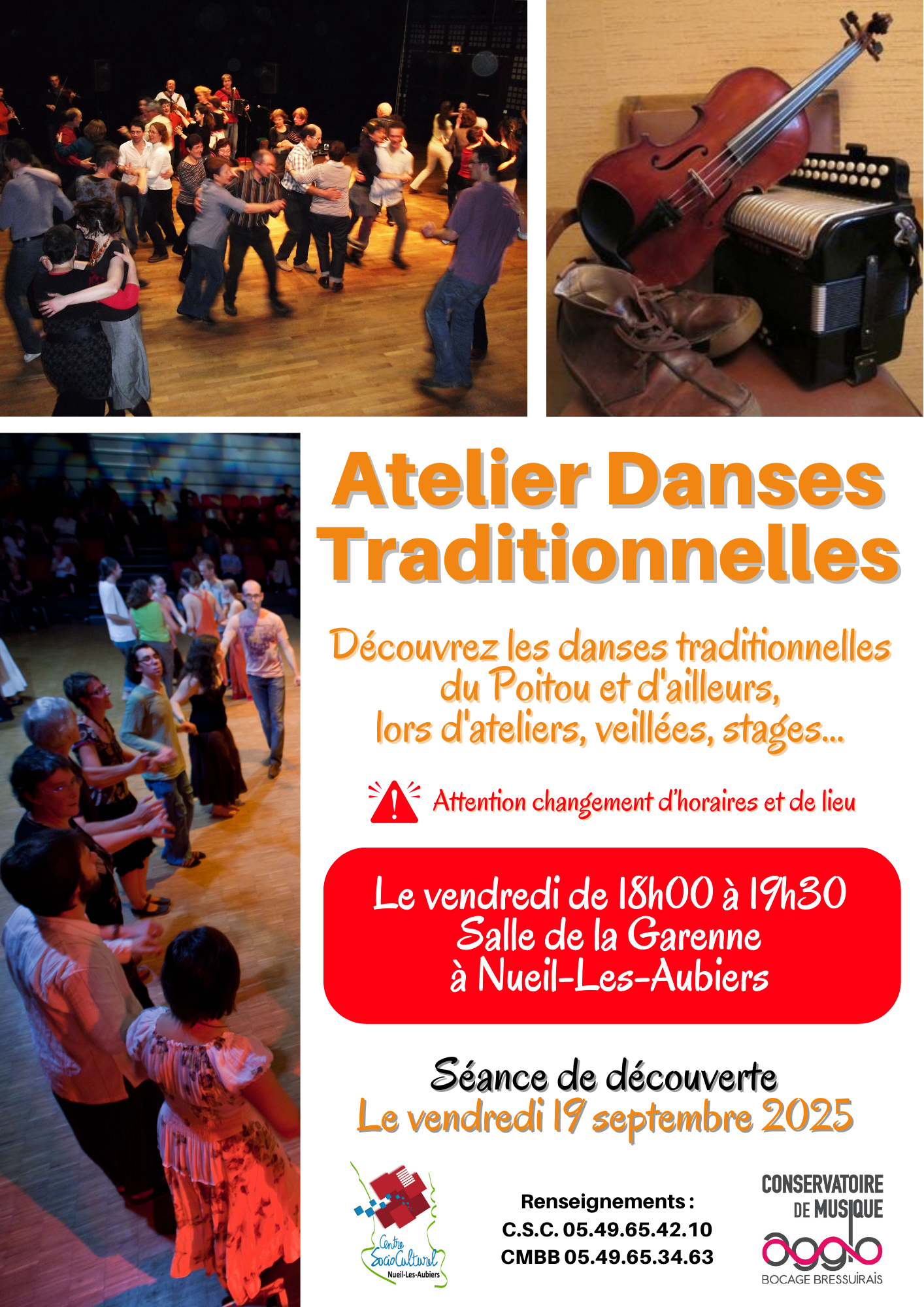 Venez découvrir les danses traditionnelles du Poitou et d’ailleurs, encadré par Marif, Mathieu, Jean Marie et des intervenants extérieurs. Atelier en collaboration avec le Conservatoire de Musique de l’Agglo2B.