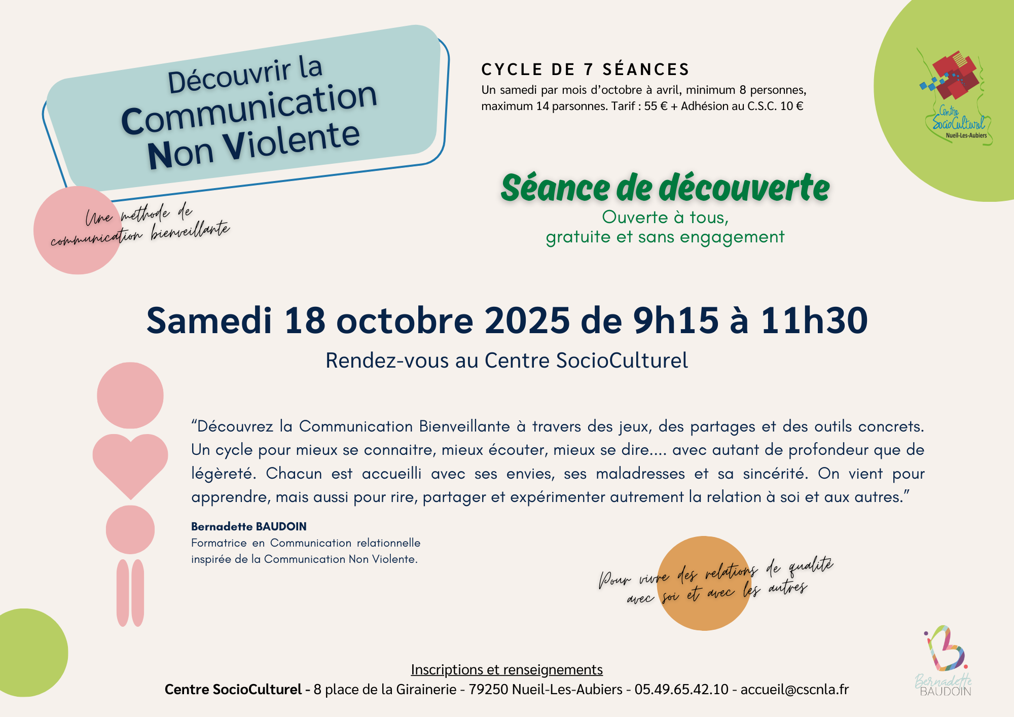 Pour tous renseignements, vous pouvez contacter Marie Line PILLET-GABARD, référente Famille du C.S.C. : famille cscnla.fr